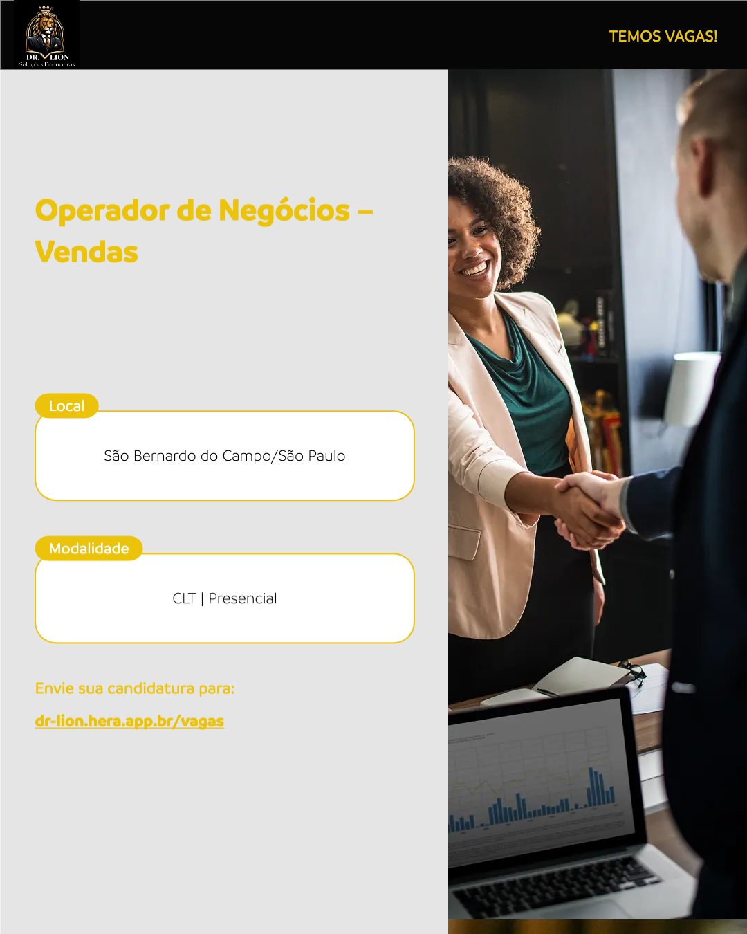 Buscamos um Operador de Negócios – Vendas para atuar na prospecção e atendimento de clientes, com foco em fechamento de negócios e alcance de metas comerciais. O cargo oferece salário fixo mais comissões agressivas sobre as vendas realizada.